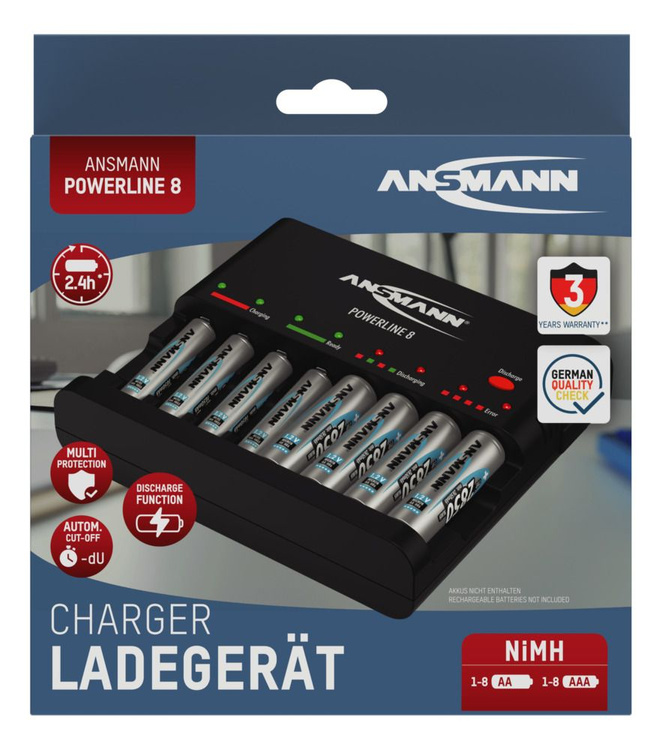 ANSMANN Powerline 8 umożliwia jednoczesne ładowanie aż 8 akumulatorów AA lub AAA, co czyni ją praktycznym rozwiązaniem do domowego i profesjonalnego zastosowania.