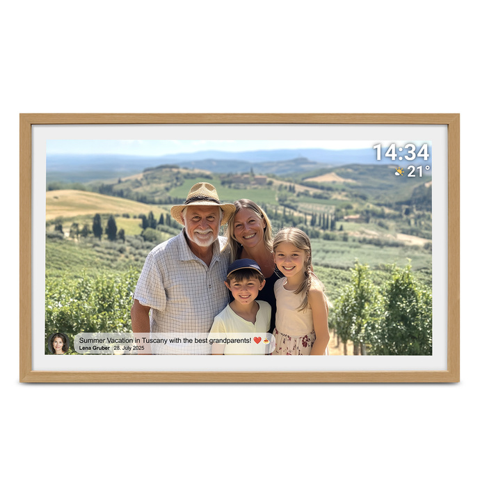 Dzięki aplikacji Frameo możesz zaprosić członków rodziny lub znajomych do współdzielenia zdjęć i filmów — wystarczy zainstalować aplikację na smartfonie i wysłać multimedia bezpośrednio do ramki. To funkcjonalność, która idealnie sprawdzi się np. gdy dziadkowie mieszkają w innym mieście — możesz stale dzielić się aktualnymi zdjęciami.
